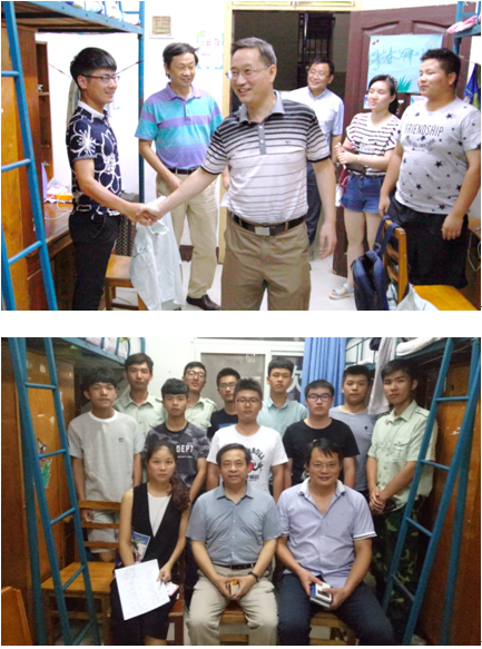 走进寝室,老师们认真查看了同学们的生活环境,然后或站立,或围坐,悉心了解同学们的个人经历、家庭情况,关心同学们生活上有什么困难,军训吃不吃得消,伙食习惯不习惯,也让同学们聊聊对老员工活有什么想法,对学校有什么要求建议,或是与同学们分享自己的老员工活经验,以勉励同学们珍惜难得的大学时光,激励起大家努力成为国家有用之才的热情和信心。比如彭书记就谈到同学们在大学期间要注重培养自己正确的核心价值观,“核心价值观的养成绝非一日之功,要坚持由易到难、由近及远,努力把核心价值观的要求变成日常的行为准则,进而形成自觉奉行的信念理念!”张书记则建议同学们不断提升自己的思想境界,“同学们要不断学习、提高认识,努力把自己的思想境界上升到国家民族的高度上来。”他们的话语中都饱含对同学们成长成才的殷殷期望。