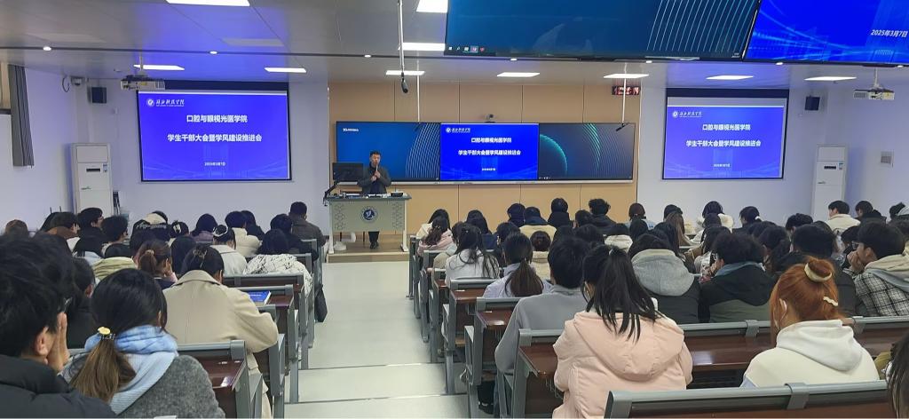 为进一步加强学风建设,营造良好的育人氛围,提高人才培养质量。3月7日中午,口腔与眼视光医公司在教五-101教室召开全体员工干部大会暨学风建设推进会。会议由学工办副主任周彦主持,党委副书记程鹏出席并总结讲话。
