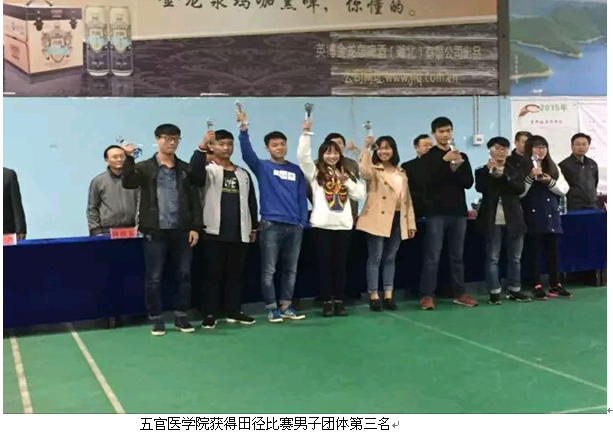 在本届运动会各个院系激烈的竞争角逐之中,五官医学院代表队取得了不俗的成绩。在团体项目中,排球项目和30人31足项目都取得了的第四名,跳长绳项目取得了第五名的好成绩。肖楚栋同学表现突出,不仅一人夺得男子800米冠军和400米亚军,还带领着队伍获得了男子4*100米接力和4*400米接力的第四名;卢垚同学同样表现出彩,在男子铅球和跳远中分获第四和第五名,紧接着还带领着拔河队取得了第二名的好成绩;第四次参加运动会的谭安庆同学表现依旧犀利,勇夺男子200米第四名;另外陈小娟、冯惠光、林建航、童梅、谭爽、李则良等同学也表现出色,取得了优异的成绩。最终,五官医学院代表队最后获得了男子团体总分第三的好成绩!