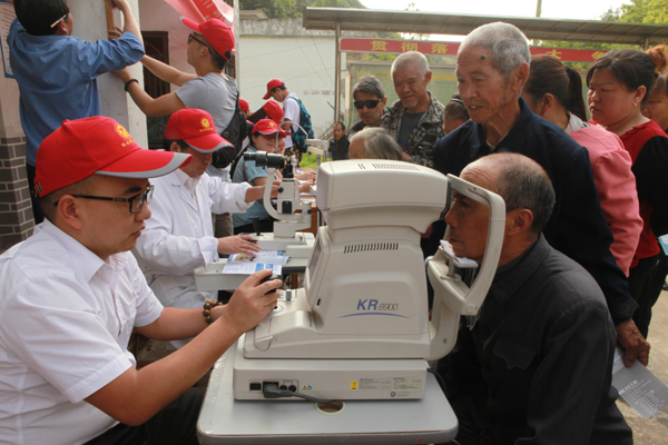 集团办公室与五官医学院开展的“党员志愿服务入村 携手爱尔拒绝眼疾”,免费为白内障患者提供手术。学校的车刚到村里,四门八方赶来的村民便自觉地排起长队,等候检查。