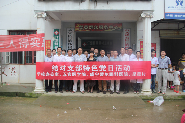 为庆祝建党93周年,7月1日上午,五官医公司党总支联合学校办公室、爱尔眼科医院在咸安区星星村携手开展“特色党日”活动,通过送医送药、科普宣传、走访访谈等形式,发挥学校医学专业优势,进一步激发了广大党员干部为民办事、为党旗增辉的热情。