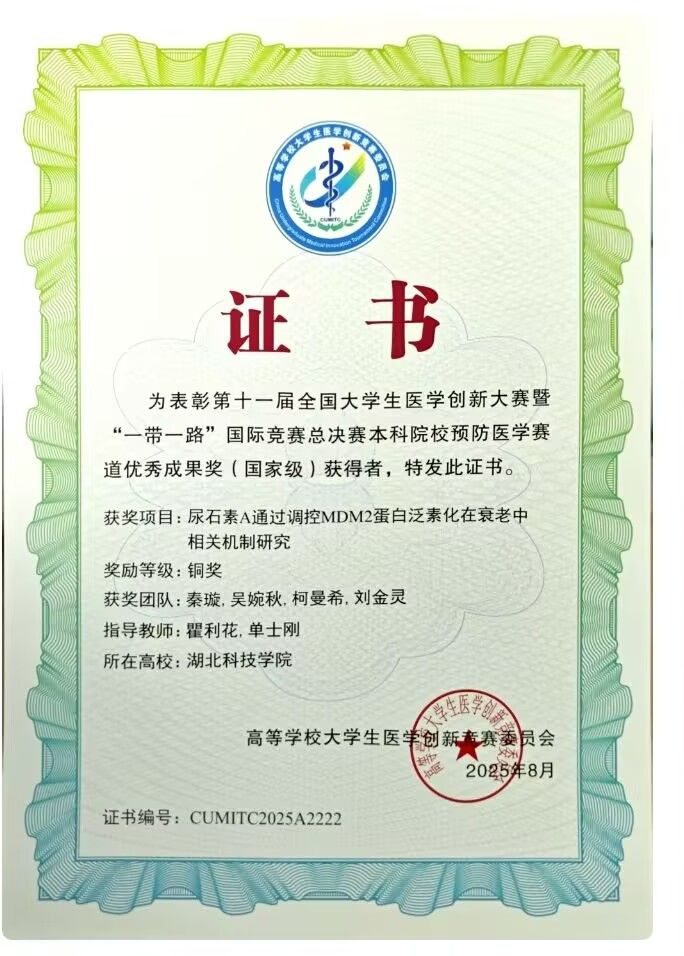 在第十一届全国老员工医学创新大赛暨“一带一路”国际竞赛中,学院师生表现尤为亮眼。由周慧芬、晏彪老师指导,2023级眼视光医学郭行健同学负责的项目《基于CRISPR-cas12a系统的KRAS基因精准诊疗体系构建研究》荣获国家金奖(最佳团队合作奖)及省级一等奖;由许波老师指导,2022级口腔医学王琳同学负责的项目《结合AI和合成生物学开发治疗高尿酸血症的功能性益生菌》项目荣获国家级银奖及省级一等奖;由黄彬、陈黄琴老师指导的项目《锰基纳米酶化学动力治疗口腔鳞状细胞癌的机制:线粒体自噬》获省赛二等奖;由刘毅飞、周燕红老师指导,2023级眼视光医学专业张乐天负责的项目《补骨脂乙素靶向PARP1抑制细胞焦亡缓解溃疡性结肠炎的机制研究》获复赛三等奖;由包永芬、单士刚老师指导,2023级临床医学(眼耳鼻喉方向)王彬羽负责的项目《黄芩素调控类风湿性关节炎和炎症相关机制研究》获省赛三等奖,此外,多个项目在省级赛中获优秀奖,涵盖口腔医学、眼视光医学、基础临床、交叉学科等多个赛道。
