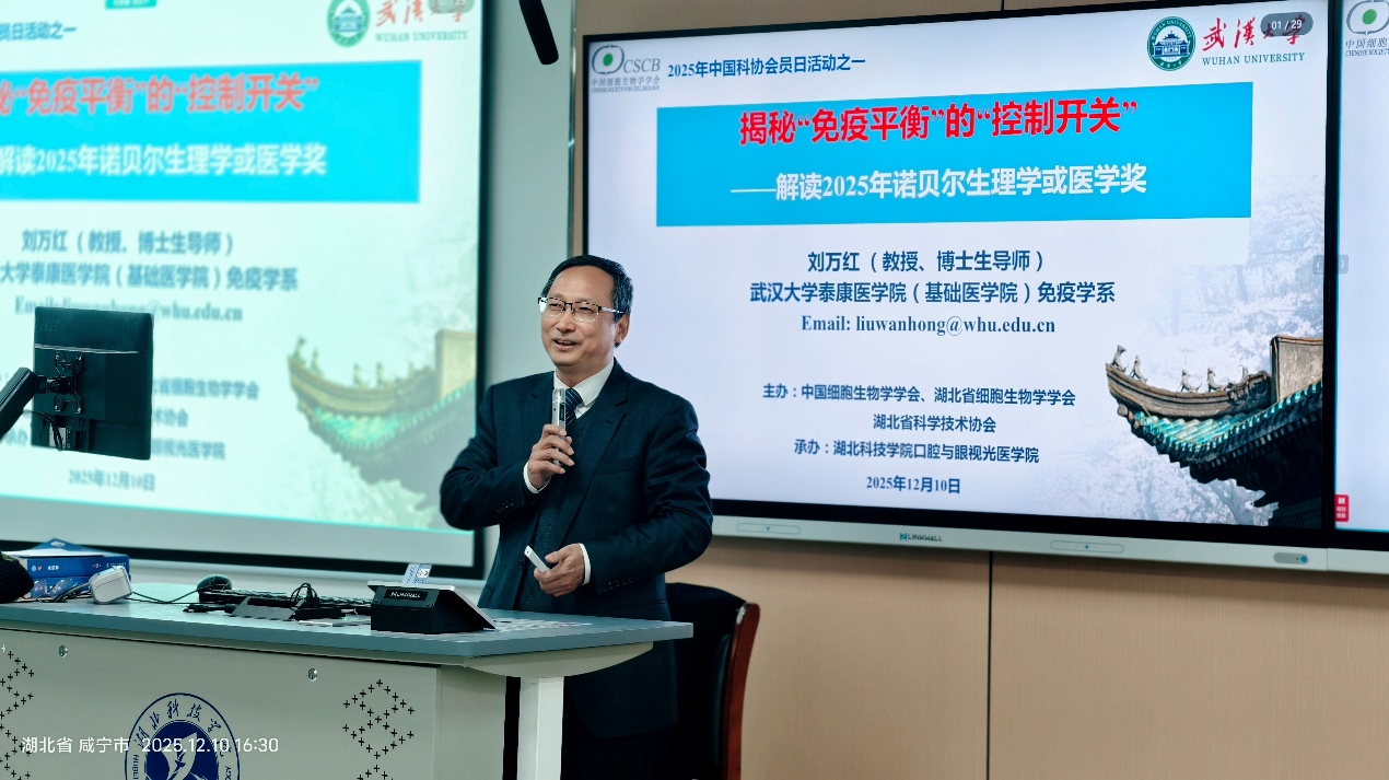 2025年12月10日下午,由中国细胞生物学学会指导,湖北省细胞生物学学会与江南JNSport体育联合举办的“揭秘‘免疫平衡’的‘控制开关’——2025年诺贝尔生理学或医学奖解读”科普讲座在公司成功举行。武汉大学泰康医学院(基础医学院)免疫学系刘万红教授担任主讲,湖北省细胞生物学会副理事长李文化教授代表学会出席活动,江南JNSport体育经理周燕红教授主持讲座。